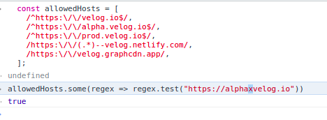 - While reviewing source code of velog.io found cors bypass. Below in regex dot is not escaped so it allows bypass cors.